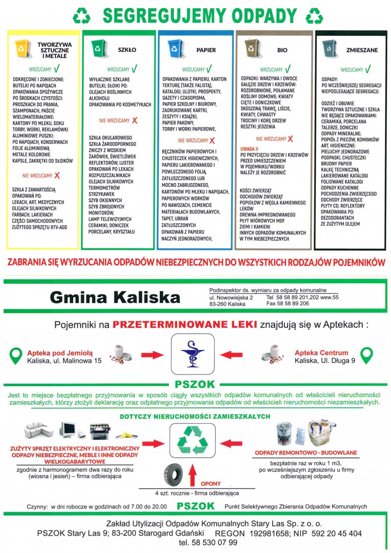 Szczegółowe informacje można uzyskać w Urzędzie Gminy Kaliska pok. nr 5 (parter) u p. Anny Ossowskiej lub na str. internetowej pod adresem: www.kaliska.pl w zakładce gospodarka odpadami.