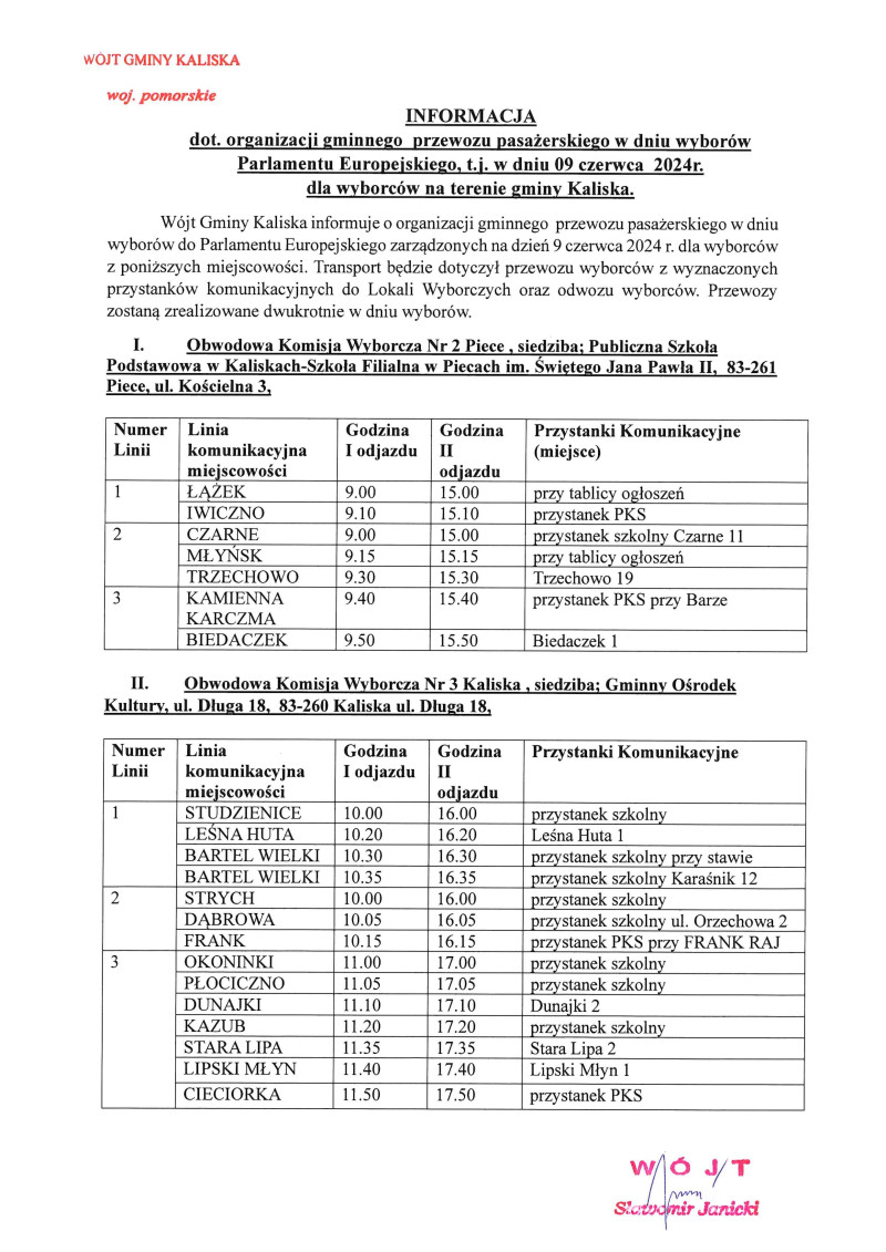 Informacja o organizacji gminnego przewozu pasażerskiego w dniu wyborów do Parlamentu Europejskiego