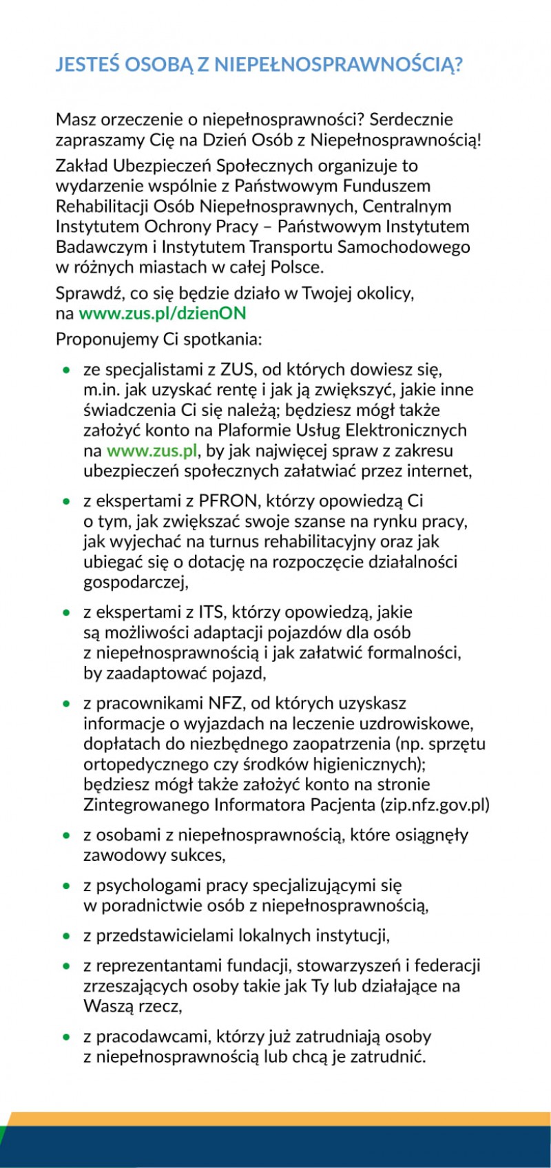 W siedzibie Inspektoratu przy ul. Marszałka Józefa Piłsudskiego 4, od 9 do 14 eksperci z ZUS będą udzielali porad i służyli informacjami dotyczącymi projektów, których celem jest przełamywanie barier w pracy i życiu codziennym. Od specjalistów będzie można dowiedzieć się, jak uzyskać rentę i jak ją zwiększyć, jakie są inne świadczenia. Będzie również można założyć konto na Platformie Usług Elektronicznych, by jak najwięcej spraw z zakresu ubezpieczeń społecznych załatwiać przez internet. Pracodawcy, którzy już zatrudniają osoby z niepełnosprawnością lub chcą je zatrudnić dowiedzą się o działaniach ZUS w ramach prewencji rentowej i wypadkowej czy świadczeniach pozwalających utrzymać zdolność do pracy mimo szczególnych wymagań zdrowotnych.