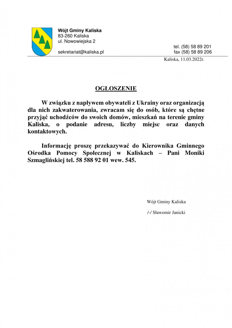 Informacja o przyjmowaniu uchodźców przez mieszkańców