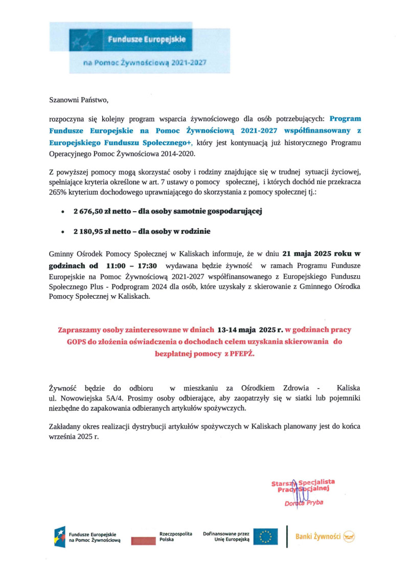Informacja o wydawaniu żywności w dniu 21.05.2025 r.