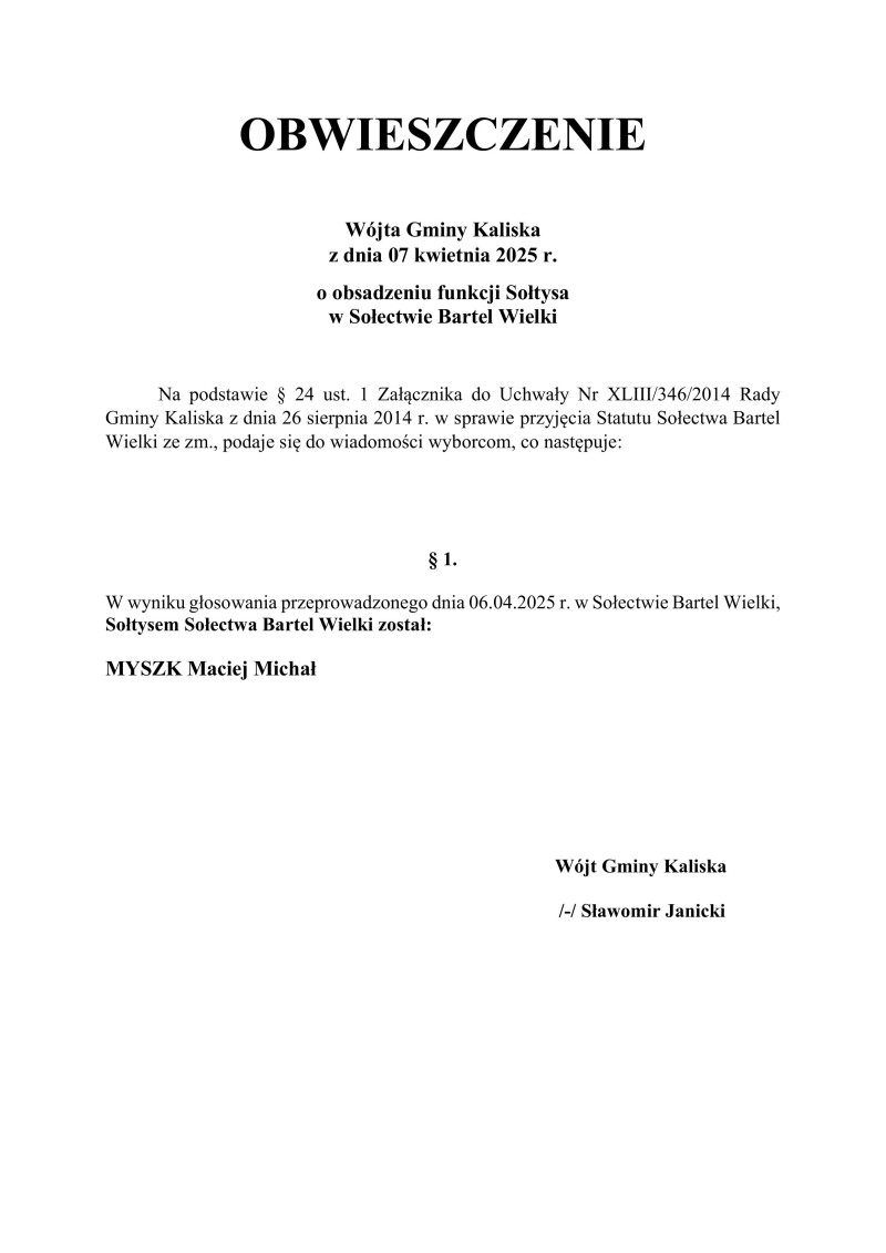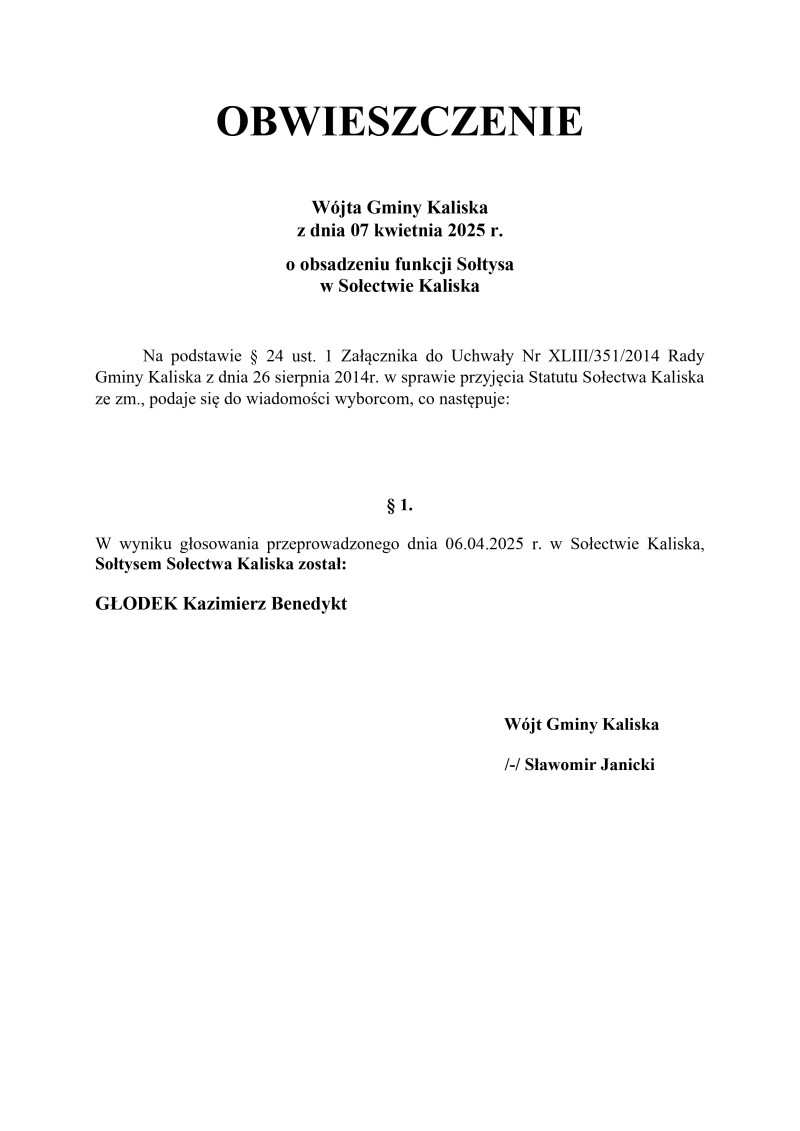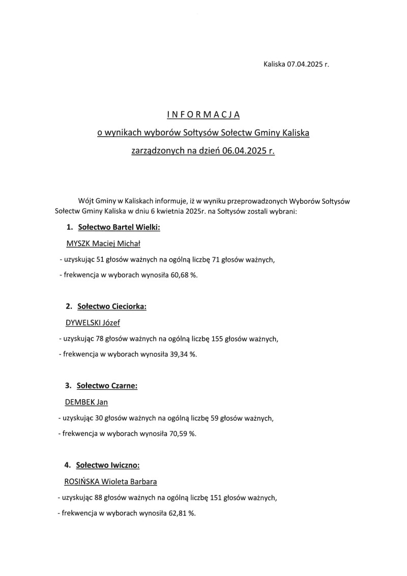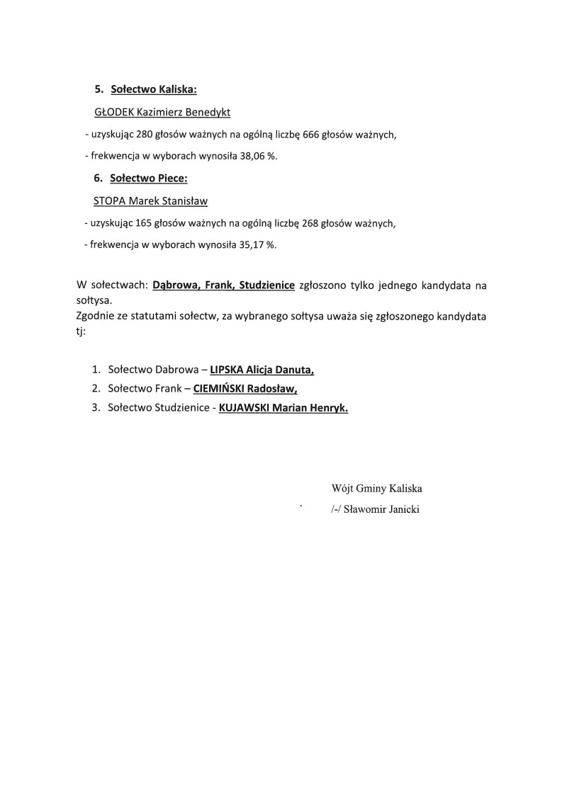 Informacja o wynikach wyborów Sołtysów Sołectw Gminy Kaliska