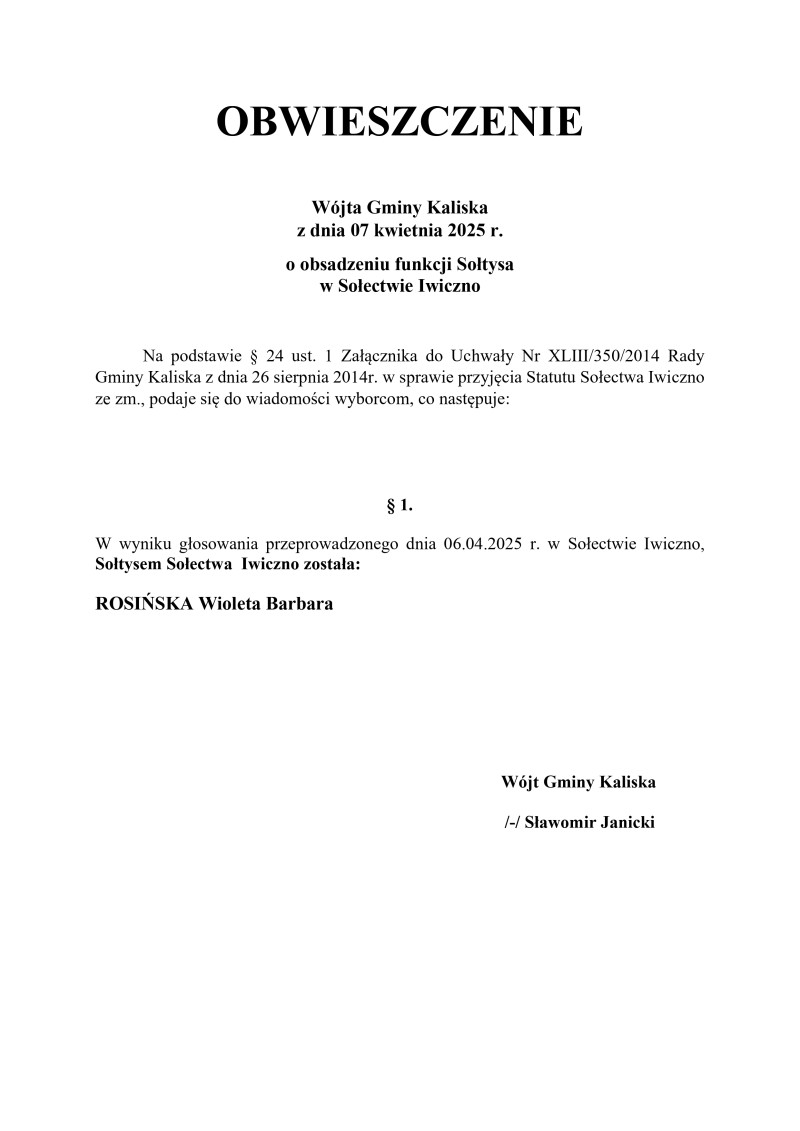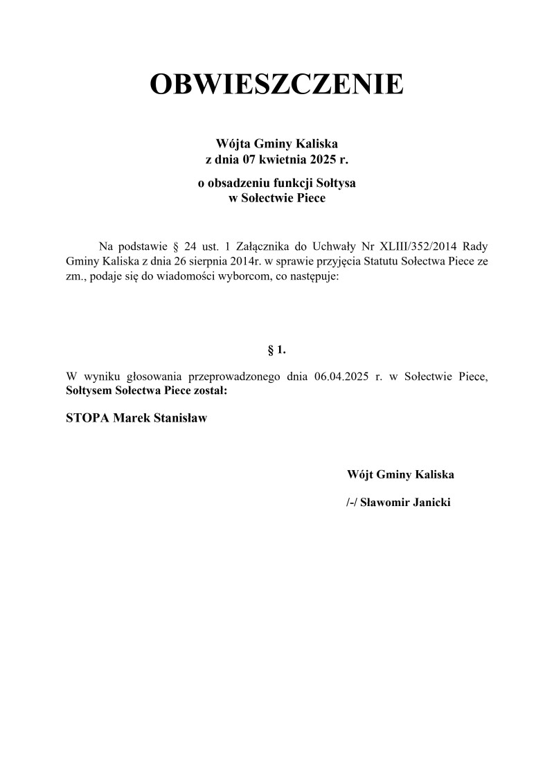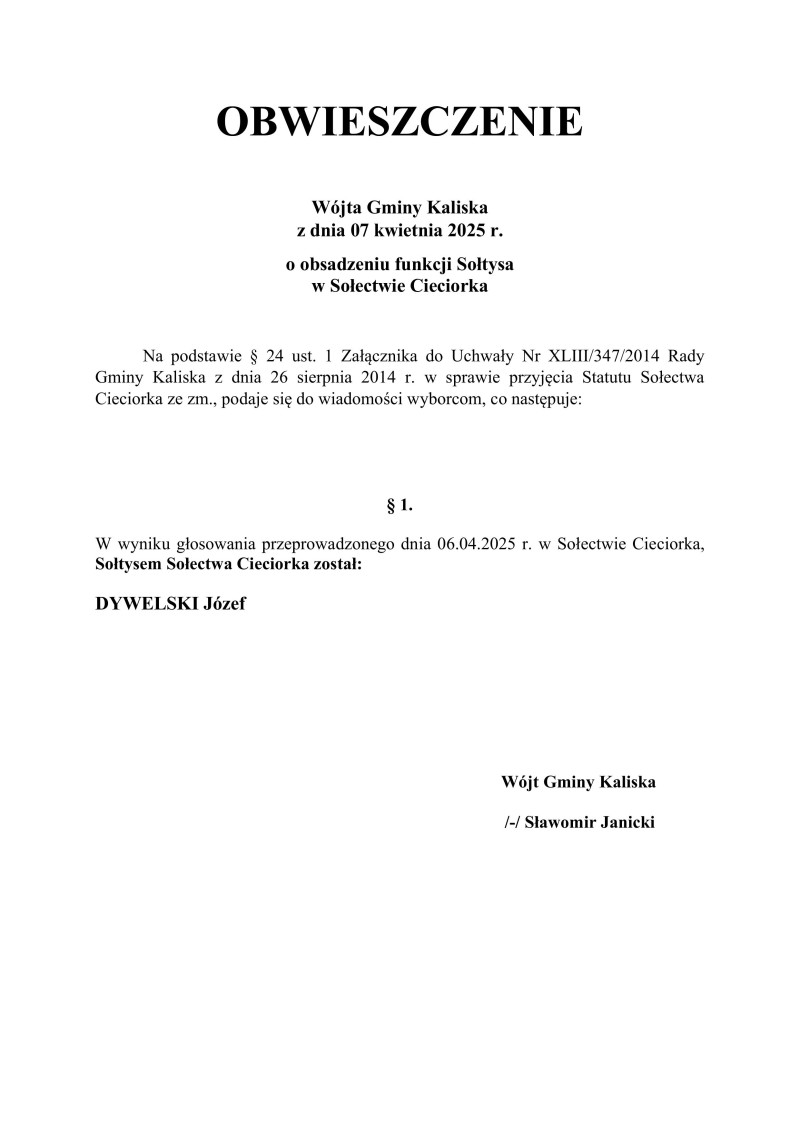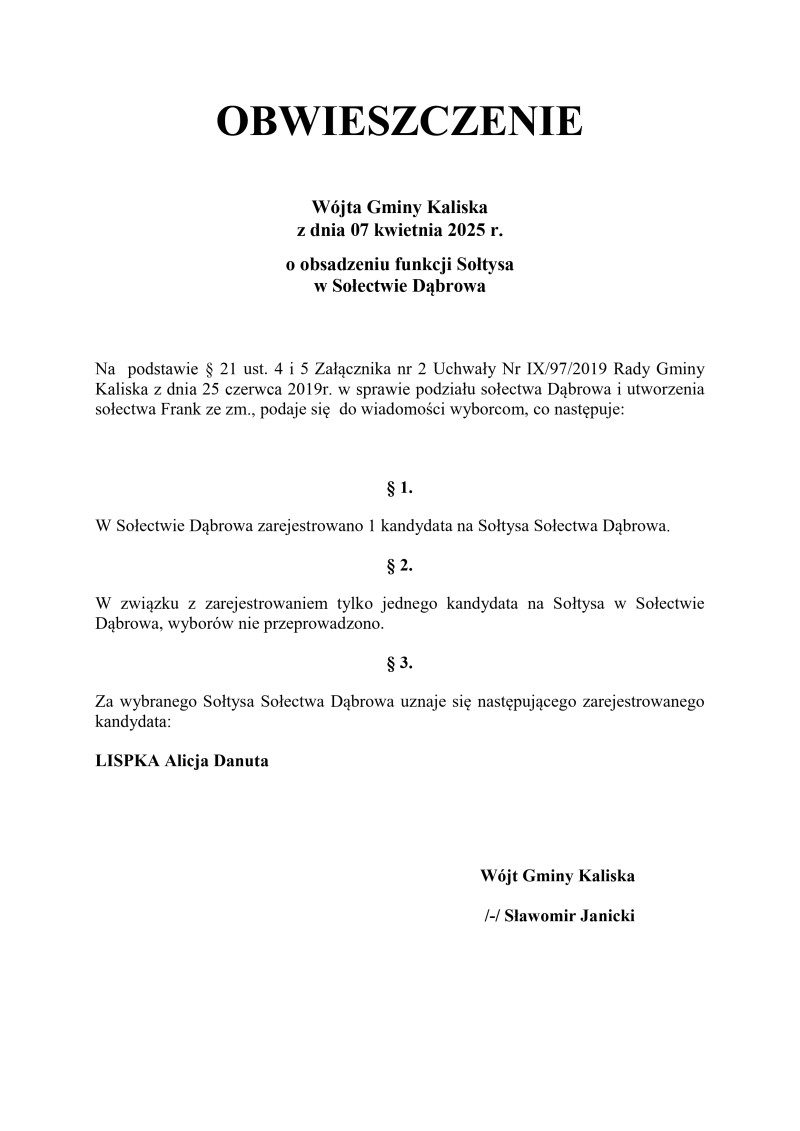 Informacja o wynikach wyborów Sołtysów Sołectw Gminy Kaliska