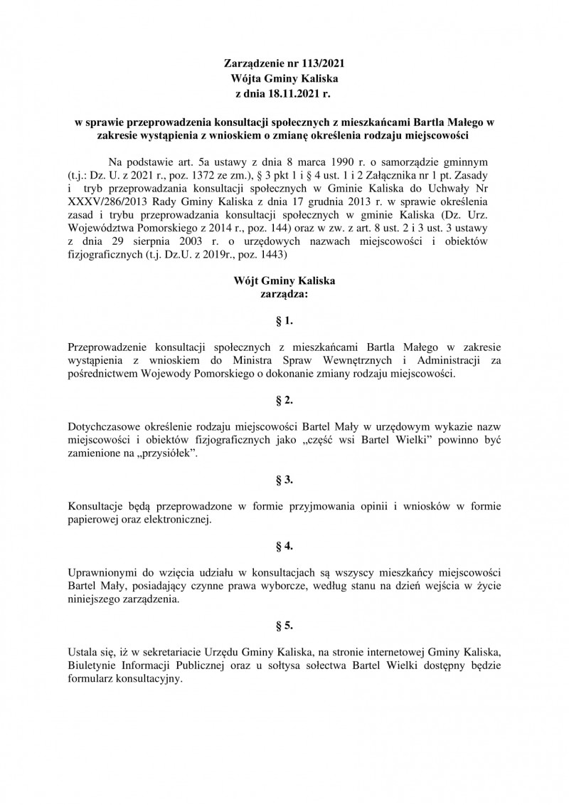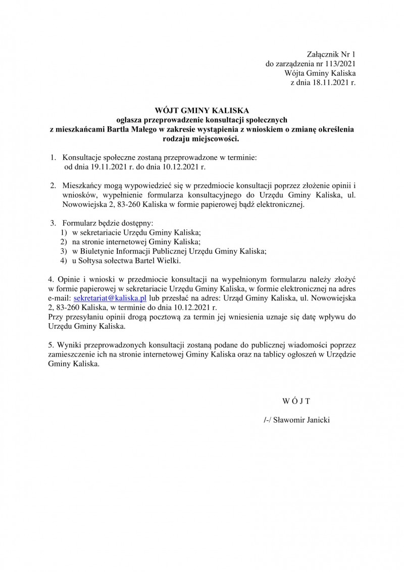 Informacja w sprawie przeprowadzenia konsultacji społecznych z mieszkańcami Bartla Małego