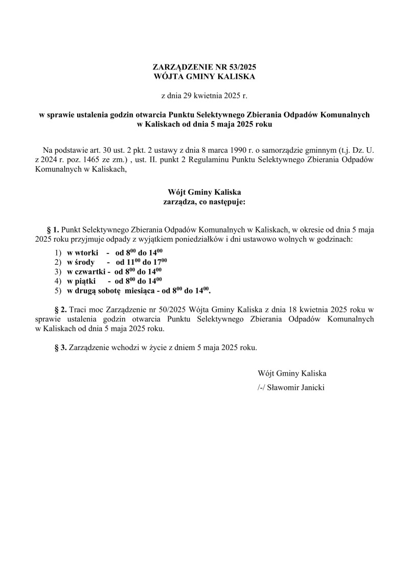 Informacja w sprawie zmiany ustalenia godzin otwarcia PSZOK w Kaliskach