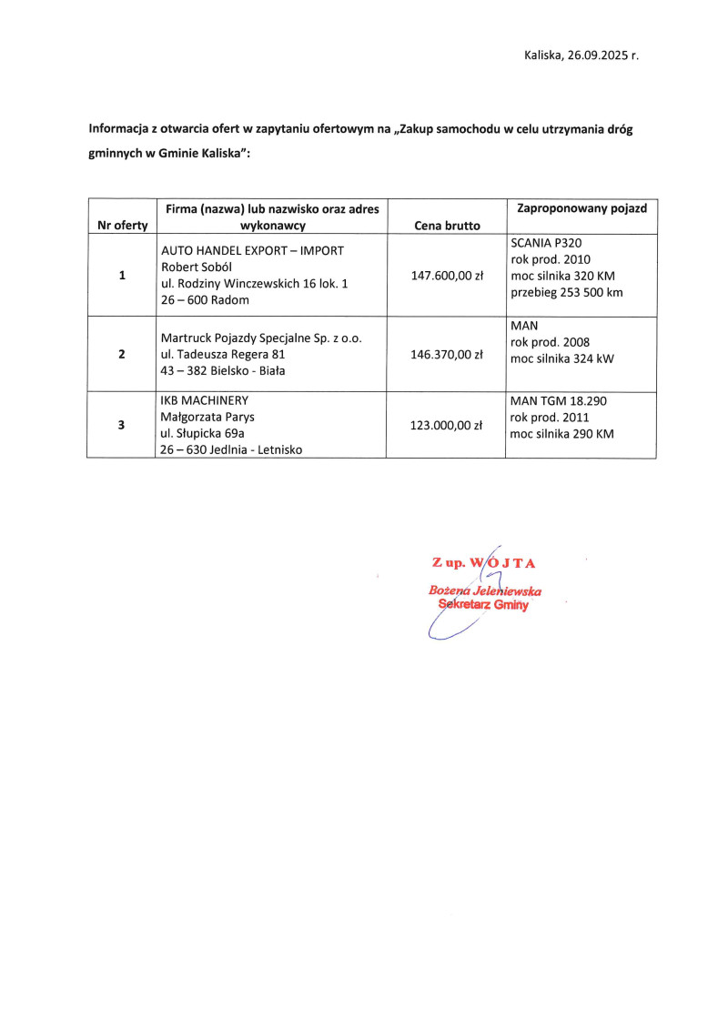 Informacja z otwarcia ofert na zakup samochodu w celu utrzymania dróg gminnych w Gminie Kaliska