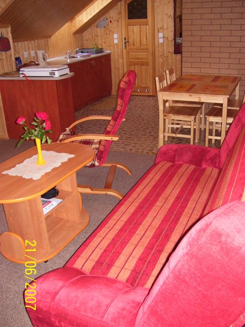 Kwatera położona w odległości ok. 70 m od jeziora Okoninki, 1,5 km od jeziora Kazub, ok. 90 km od Bałtyku. Kwatera otoczona sosnowym lasem, całoroczna. W ofercie dwa mieszkania, w tym: 1/ dla 6 osób 2/dla 7 osób oraz pokój 2-osobowy kuchnia i łazienka.  Dostępny sprzęt RTV . Wyżywienie we własnym zakresie. Biblioteczka, gry planszowe, zabawki, plac zabaw dla dzieci, miejsce do grillowania, w pobliżu jezioro, miejsce do gry w siatkówkę, badminton i boulles, istnieje możliwość wypożyczenia rowerów. W okolicy możliwość jazdy konnej przejażdżek bryczką , spływu kajakowego.