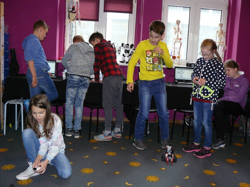 Dla klas IV i V wycieczki odbyły się do pracowni Pana Ciekawskiego na warsztaty z robotyki, gdzie poznawali matematykę jako królową nauk i podstawę wszystkich innych dziedzin, bo to właśnie matematyka jest dostępna w chemii, fizyce, biologii czy nawet medycynie. Praca odbywała się metodą projektową, w kolejności zasad: wyłonienie lidera grupy, zdefiniowanie problemu, funkcji poszczególnych członków, przeszukanie dostępnych zasobów wiedzy, postulaty rozwiązań, wybór rozwiązania, prezentacja. Na zajęciach uczniowie poznawali najnowsze trendy ICT oraz współczesnej robotyki. Pracując na najnowszym technologicznie sprzęcie z dostępem do pełnej bazy programowej i szerokopasmowego internetu, zadaniem uczestników było zbudowanie i zaprogramowanie robota. Końcowym punktem programu było zaprogramowanie robota człekokształtnego do gry w piłkę nożną.