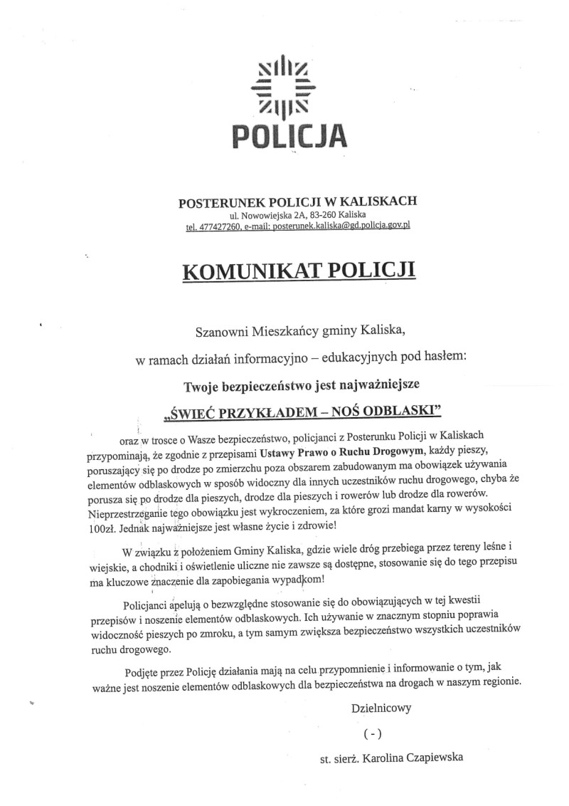 Komunikat Policji - ,,ŚWIEĆ PRZYKŁADEM - NOŚ ODBLASKI''