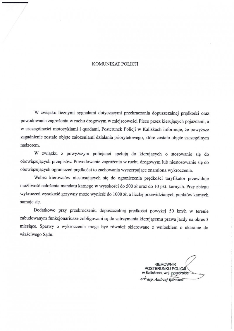 Komunikat Policji w sprawie przekraczania dopuszczalnej prędkości w miejscowości Piece