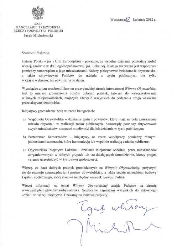 List Szefa Kancelarii Prezydenta RP w sprawie Witryny Obywatelskiej