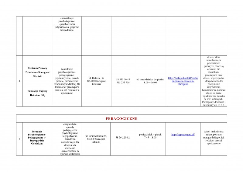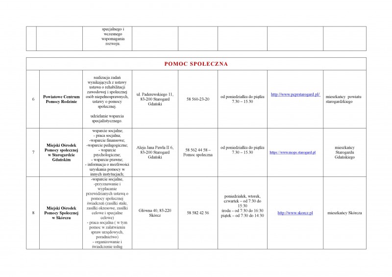 - Skórcz – punkt prowadzony przez Stowarzyszenie OVUM z siedzibą w Gdyni, ul. Traugutta 2, 81-388 Gdynia. Nieodpłatne poradnictwo obywatelskie będzie udzielane przez adwokata. Kontakt tel. 58 350 15 15 (w godzinach od 12.00 do 20.00), www.ovum.org.pl