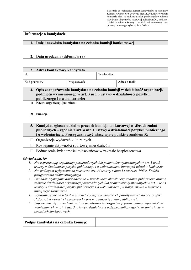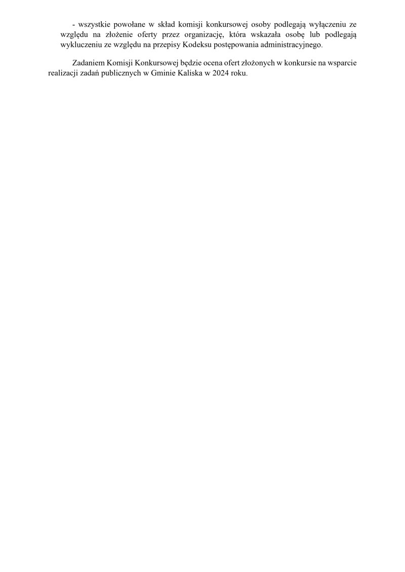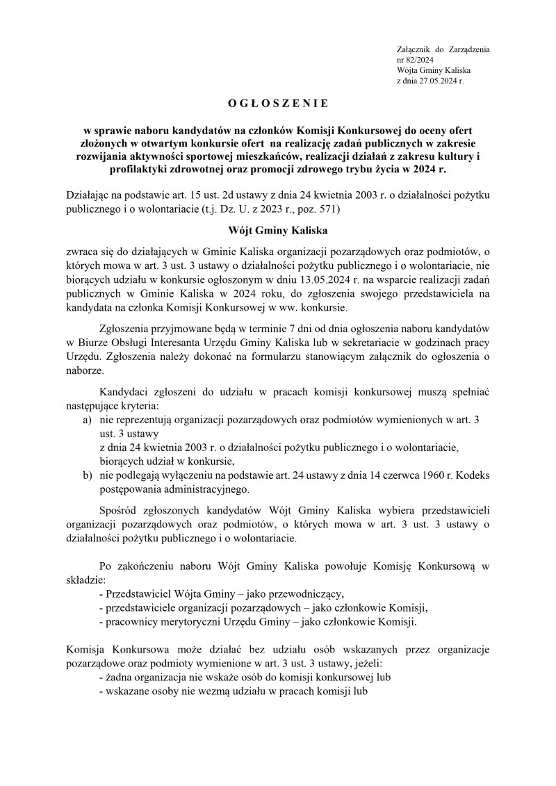 Wójt Gminy Kaliska zwraca się do działających w Gminie Kaliska organizacji pozarządowych oraz podmiotów, o których mowa w art. 3 ust. 3 ustawy o działalności pożytku publicznego i o wolontariacie nie biorących udziału w konkursie ogłoszonym w dniu 13.05.2024 r. na wsparcie realizacji zadań publicznych w Gminie Kaliska w 2024 roku do zgłoszenia swojego przedstawiciela na kandydata na członka Komisji Konkursowej w ww. konkursie.