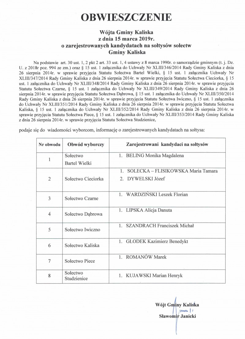 Obwieszczenie o zarejestrowanych kandydatach na sołtysów sołectw Gminy Kaliska