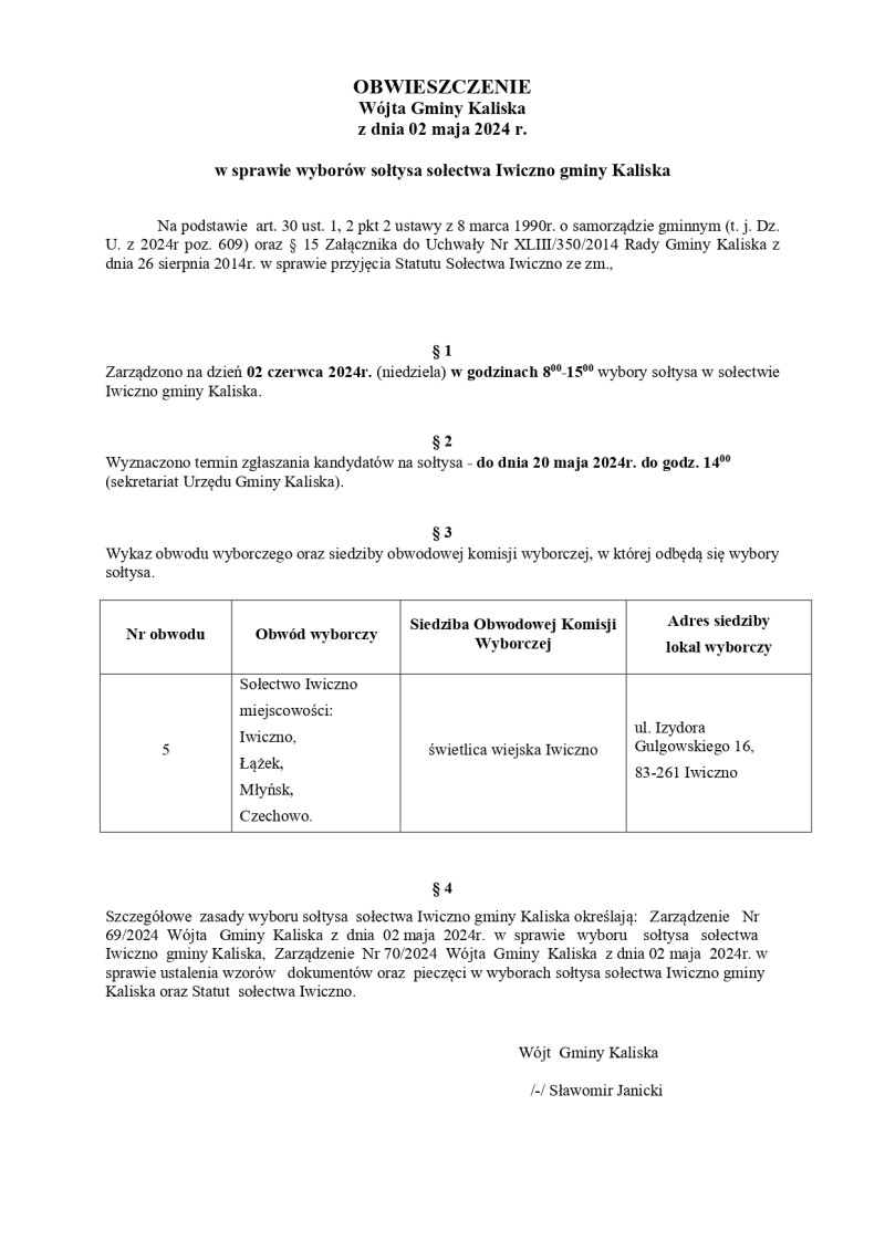 Obwieszczenie Wójta dot. wyboru Sołtysa w Sołectwie Iwiczno