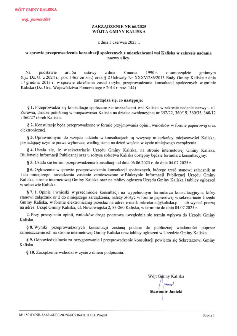 Ogłoszenie o konsultacjach społecznych z mieszkańcami wsi Kaliska