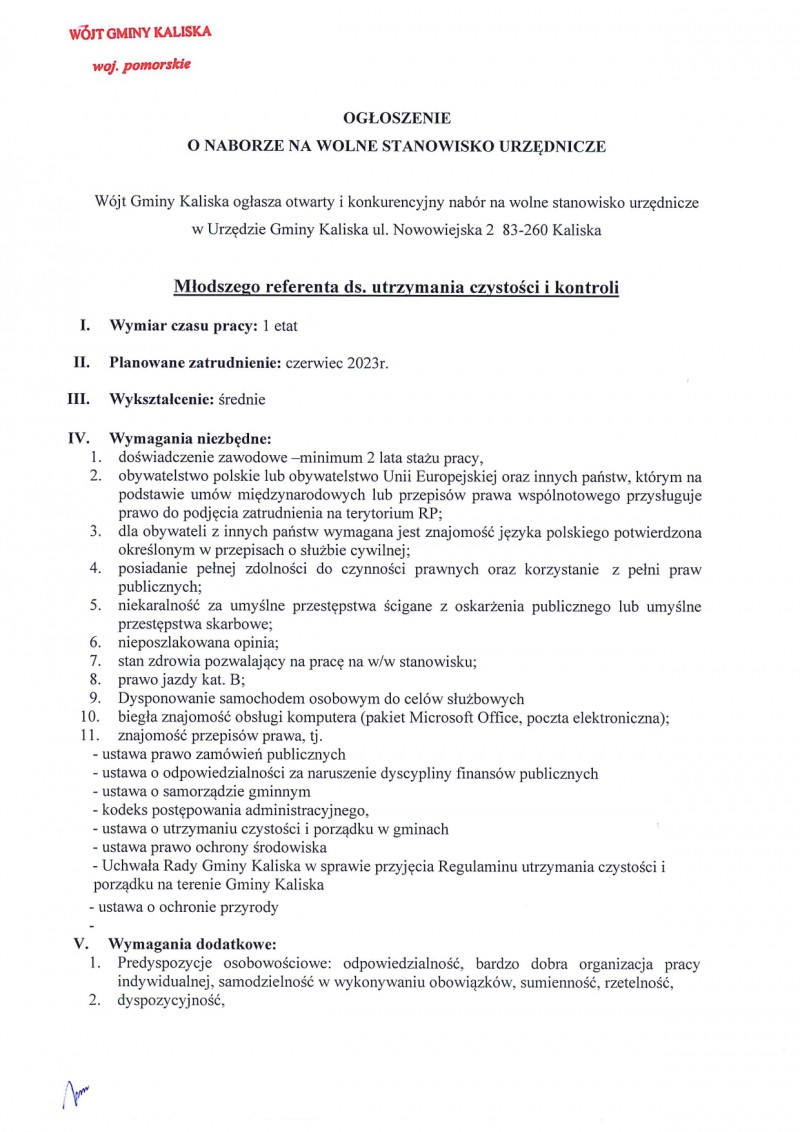 Ogłoszenie w sprawie naboru na wolne stanowisko urzędnicze - Młodszy referent ds. utrzymania czystości i kontroli