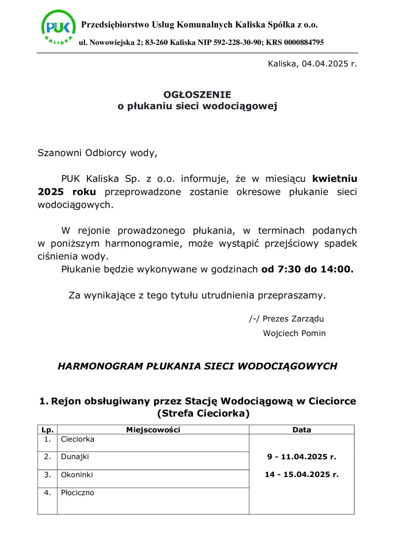 Ogłoszenie o płukaniu sieci wodociągowej