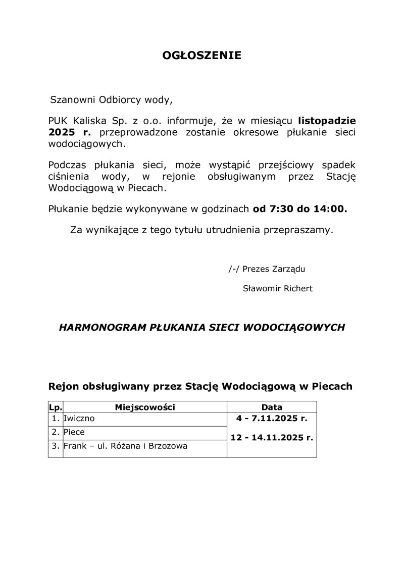 Ogłoszenie o płukaniu sieci wodociągowej