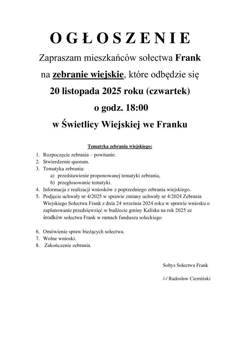 Ogłoszenie o zebraniu wiejskim Sołectwa Frank