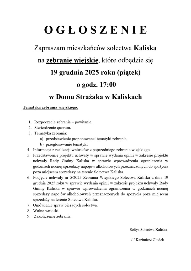Ogłoszenie o zebraniu wiejskim sołectwa Kaliska