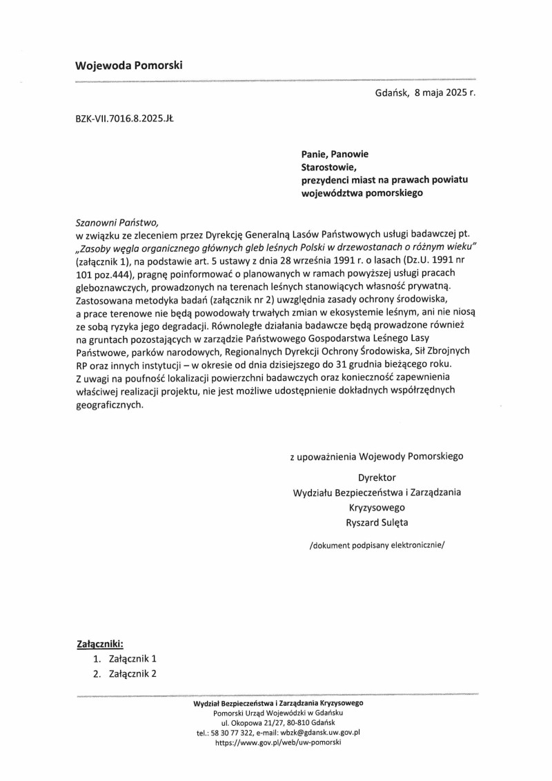 W nawiązaniu do pisma Wojewody Pomorskiego z dnia 8 maja 2025r. znak BZK-VII.7016.8.2025.JŁ, w zawiązku z informacją Dyrekcji Generalnej Lasów Państwowych w ramach zlecenia usługi badawczej pt. „Zasady węgla organicznego głównych gleb leśnych Polski w drzewostanach o różnym wieku”, Wójt Gminy Kaliska informuje o planowanych pracach gleboznawczych prowadzonych na terenach leśnych, stanowiących własność prywatną. Zastosowana metodyka badań uwzględnia zasady ochrony środowiska, a prace terenowe nie będą powodowały trwałych zmian w ekosystemie leśnym, ani nie niosą ze sobą ryzyka jego degradacji. Przedmiotowe pracę wykonywane będą w okresie od dnia 8 maja do dnia 31 grudnia bieżącego roku. W załączeniu przedmiotowe pismo Wojewody Pomorskiego.