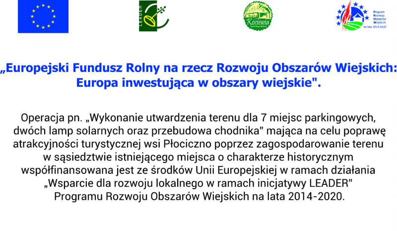 Operacja polegać będzie na budowie na działkach nr 131/5 i 131/4 w Płocicznie infrastruktury rekreacyjnej w postaci 7 miejsc parkingowych oraz na przebudowie chodnika na działkach nr 72/2, 57/3 i 57/5 w Płocicznie wraz z montażem 2 lamp solarnych. Wszelkie materiały użyte do budowy miejsc parkingowych bedą spełniały wymogi bezpieczeństwa. Utwardzenie terenu planuje się z użyciem geokraty z wypełnieniem kruszywem łamanym na geowłókninie. Natomiast chodnik wykonany zostanie z kostki betonowej.