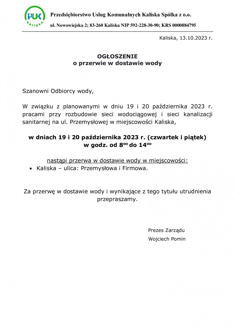 Przewa w dostawie wody w miejscowości Kaliska ul. Przemysłowa i Firmowa