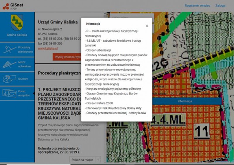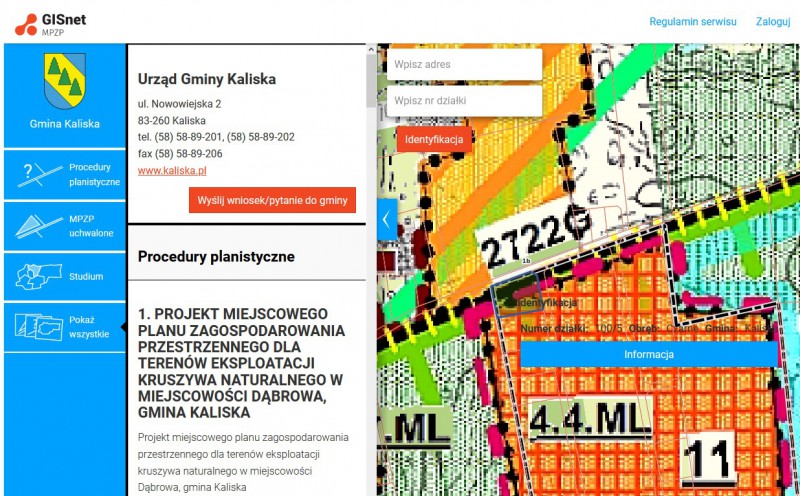 Zachęcamy Państwa do korzystania z naszej mapy interaktywnej dostępnej na stronie internetowej gminy Kaliska pod adresem www.kaliska.pl, w zakładce System Informacji Przestrzennej. Dotychczas aplikacja umożliwiała użytkownikom sprawdzenie informacji m.in. na temat trwających procedur planistycznych, obowiązujących miejscowych planów zagospodarowania przestrzennego oraz studium uwarunkowań i kierunków zagospodarowania przestrzennego.