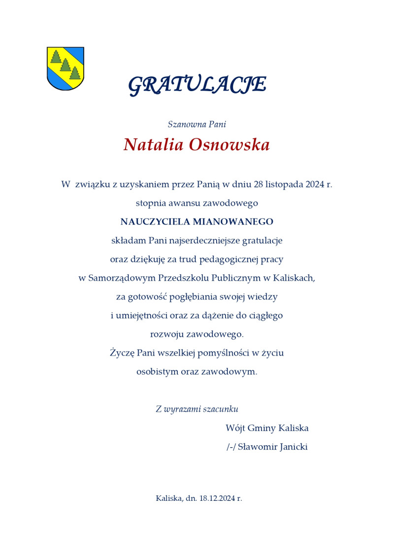 18 grudnia 2024 r. w Urzędzie Gminy w Kaliskach odbyło się wręczenie aktu nadania stopnia awansu zawodowego nauczyciela mianowanego z Samorządowego Przedszkola Publicznego w Kaliskach - Pani Natalii Osnowskiej.