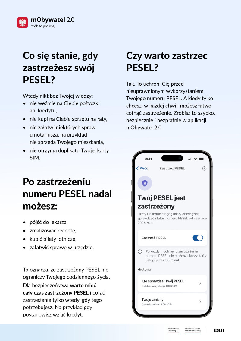 Liczba prób wyłudzeń kredytów na cudze dane rośnie. Ministerstwo Cyfryzacji wprowadziło więc do aplikacji mObywatel 2.0 usługę Zastrzeż PESEL. Dzięki niej użytkownik może zastrzec swój numer PESEL, cofnąć zastrzeżenie i ponownie je ustawić. Widzi też, jakie firmy i instytucje sprawdzały jego numer PESEL i z jakiego powodu. Od 1 czerwca 2024 instytucje finansowe będą miały obowiązek sprawdzenia statusu numeru PESEL np. przed udzieleniem pożyczki.