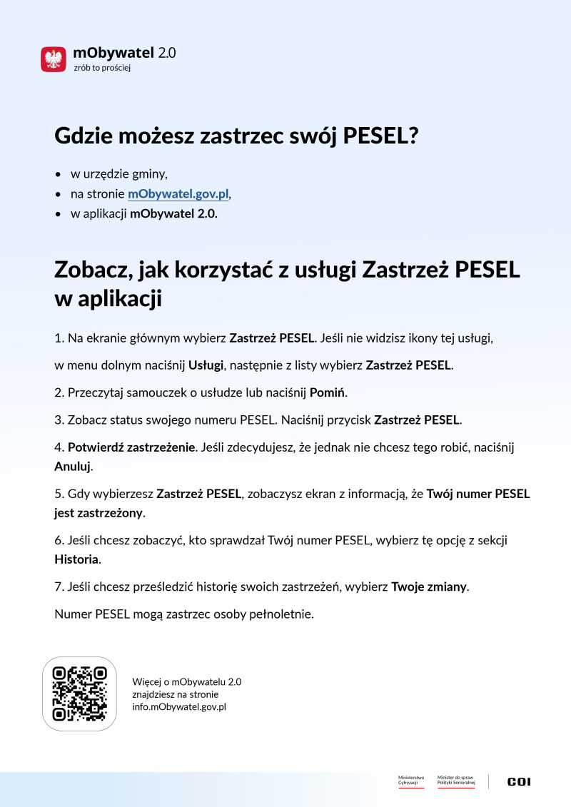 Więcej informacji o aplikacji i usłudze Zastrzeż PESEL znajdziesz na stronie www.info.mObywatel.gov.pl