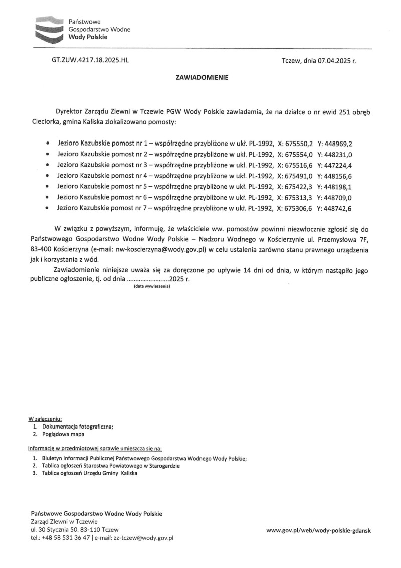 Zawiadomienie w sprawie zlokalizowanych pomostów na jeziorze Kazubskim