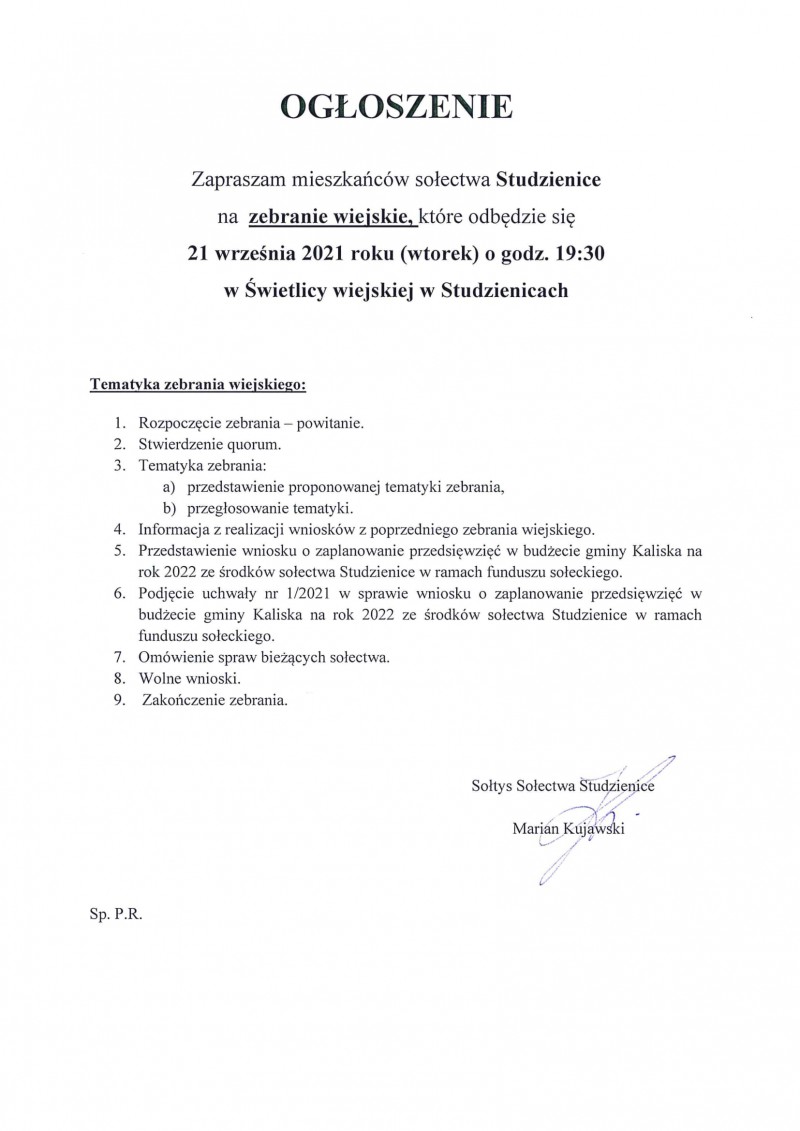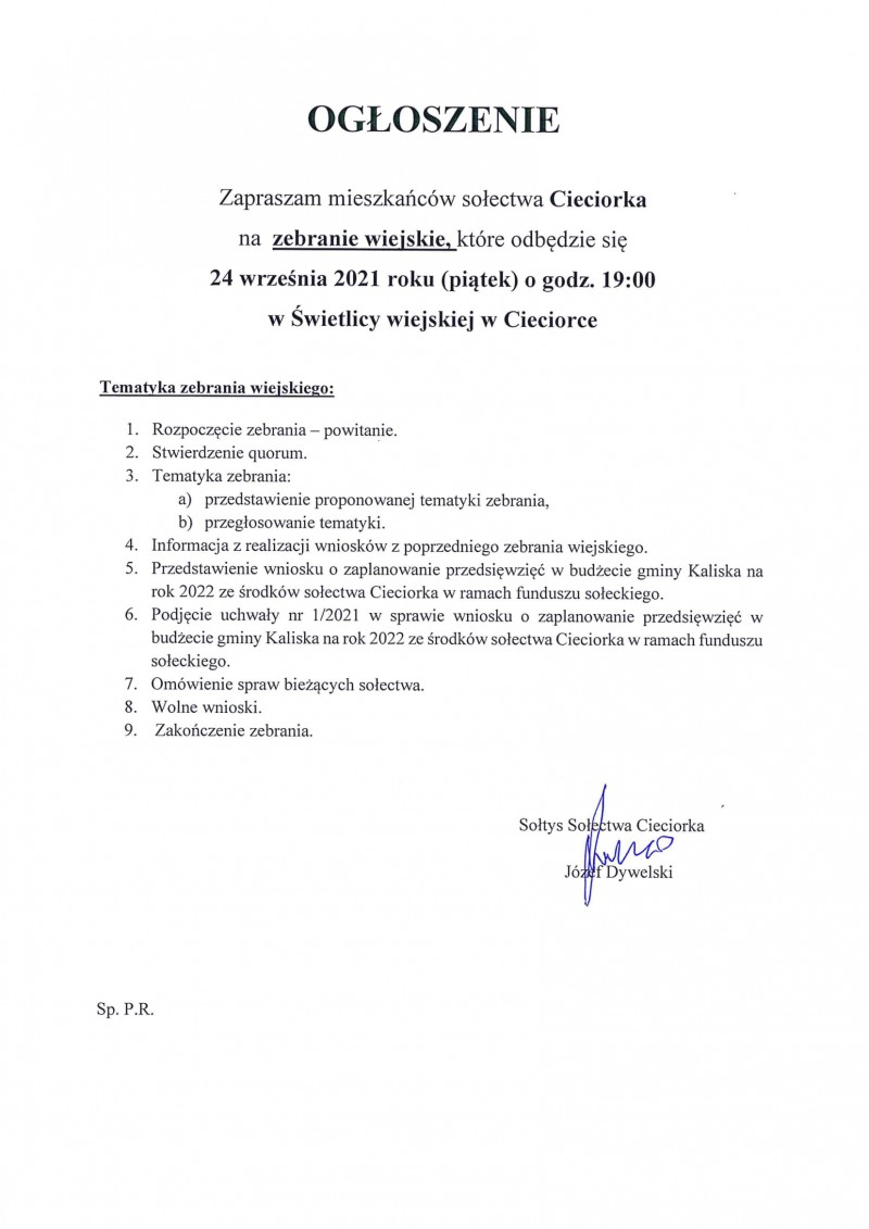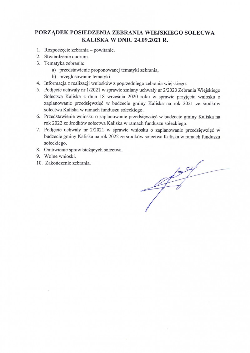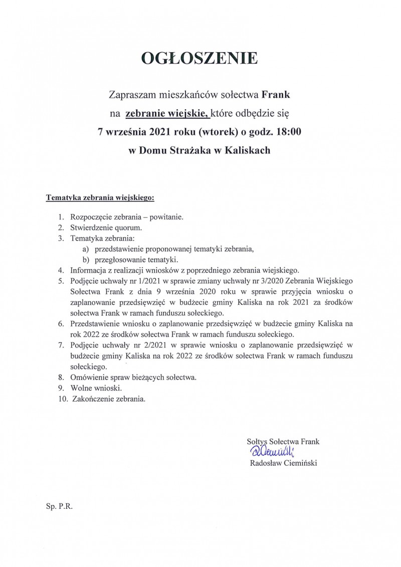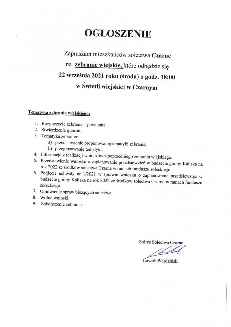 Wójt Gminy Kaliska oraz Sołtysi poszczególnych sołectw zapraszają mieszkańców gminy na zebrania wiejskie, których tematyka głownie skierowana będzie na zmiany funduszu sołeckiego na rok 2021 oraz zaplanowanie przedsięwzięć w budżecie gminy Kaliska na rok 2022 ze środków sołectw w ramach funduszu sołeckiego.