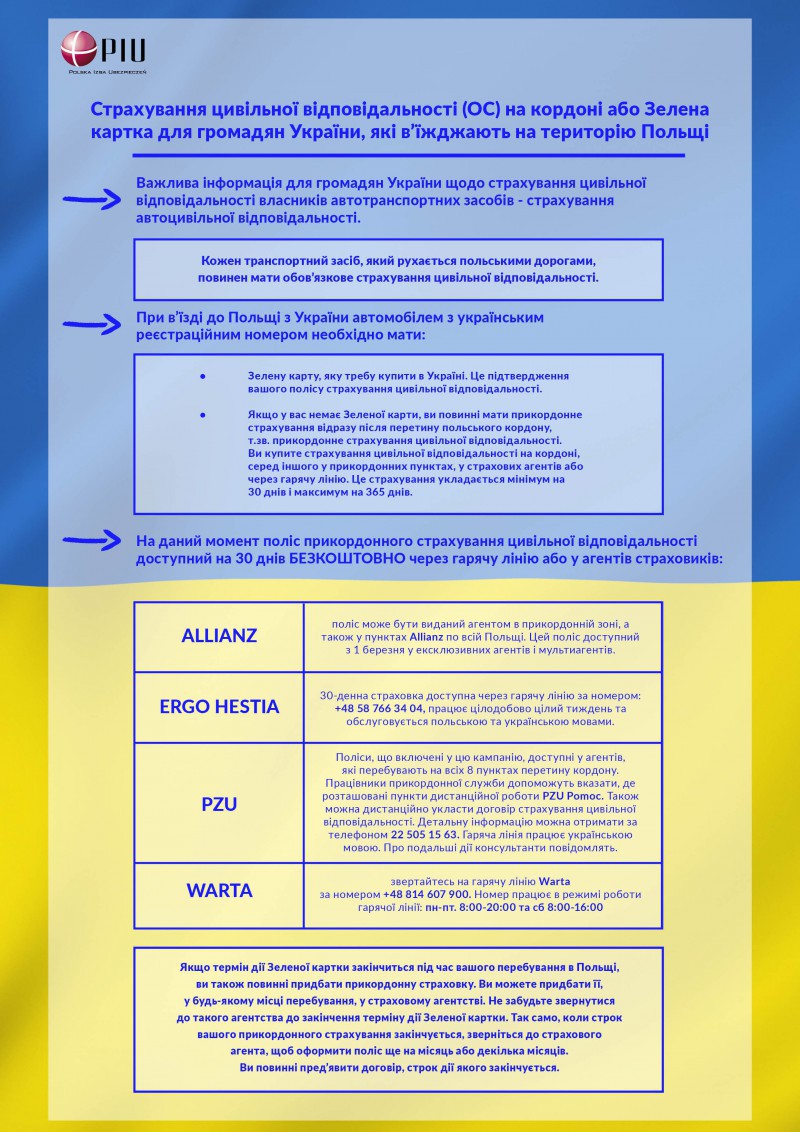 • Якщо у вас немає Зеленої карти, вам потрібна прикордонна страховка після перетину польського кордону. Прикордонне страхування на 30 днів для осіб, які в’їжджають з України, безкоштовне. Таке страхування пропонують Allianz, ERGO Hestia, PZU та Warta – страхування доступне у агентів цих компаній на прикордонних переходах або через гарячу лінію (Телефон).