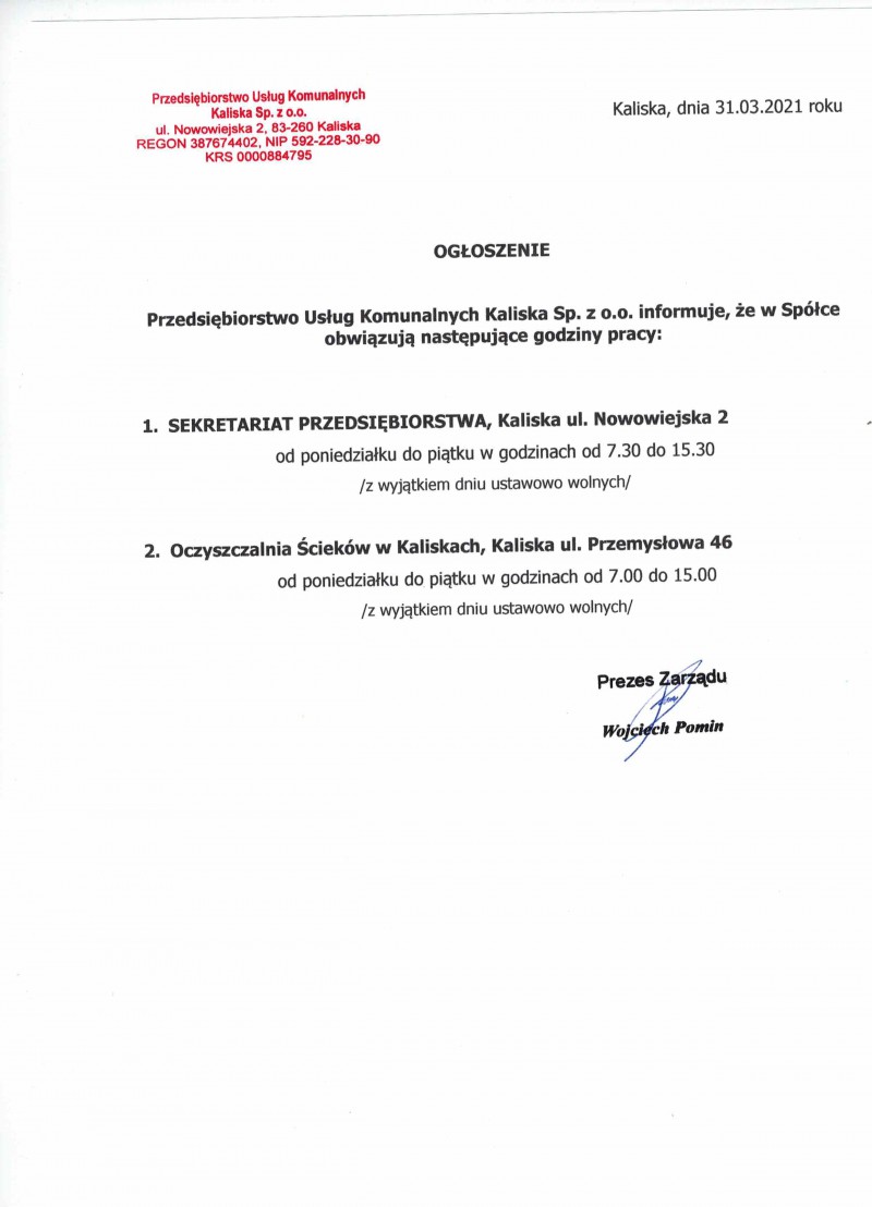 Zmiana godzin pracy w Przedsiębiorstwie Usług Komunalnych