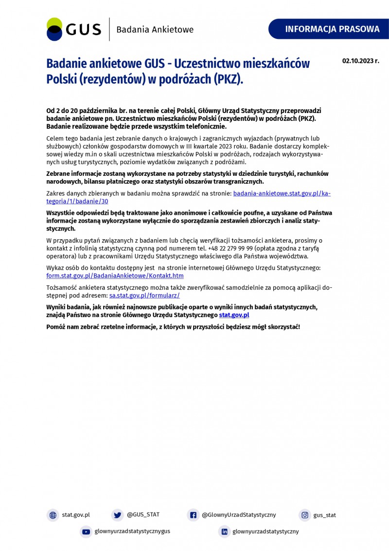 Celem tego badania jest zebranie danych o krajowych i zagranicznych wyjazdach (prywatnych lub służbowych) członków gospodarstw domowych w III kwartale 2023 roku. Badanie dostarczy kompleksowej wiedzy m.in o skali uczestnictwa mieszkańców Polski w podróżach, rodzajach wykorzystywanych usług turystycznych, poziomie wydatków związanych z podróżami.