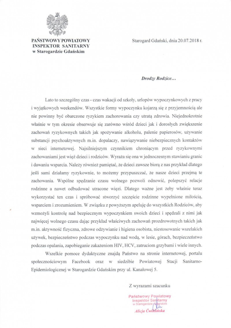 Państwowy Powiatowy Inspektor Sanitarny w Starogardzie Gdańskim informuje, że w okresie letnim prowadzi akcję ,,Bezpieczny wypoczynek'' i w związku z realizacją tego zadania przygotował list adresowany do Rodziców, zachęcający i promujący bezpieczne spędzanie wolnego czasu m.in. w czasie wakacji szkolnych i urlopów wypoczynkowych.