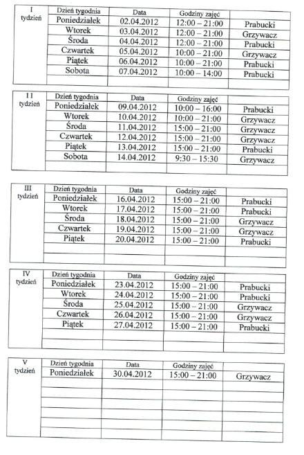 HARMONOGRAM planowanych godzin pracy Animatora – Moje Boisko – ORLIK 2012 na kwiecień 2012