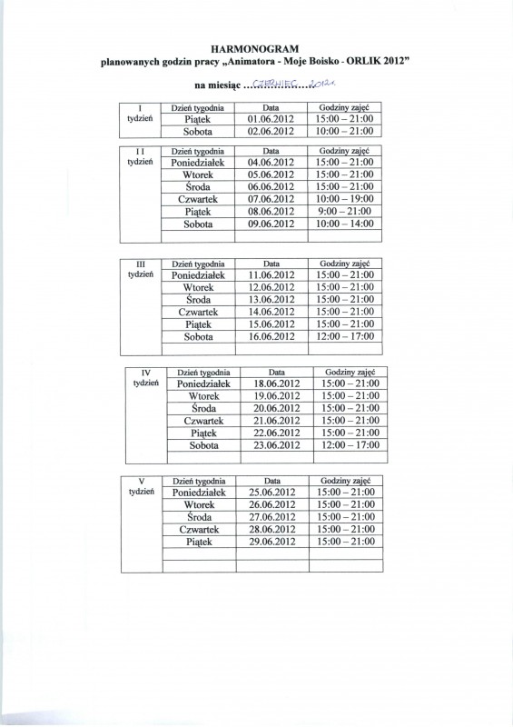 HARMONOGRAM planowanych godzin pracy "Animatora- Moje Boisko - ORLIK 2012"