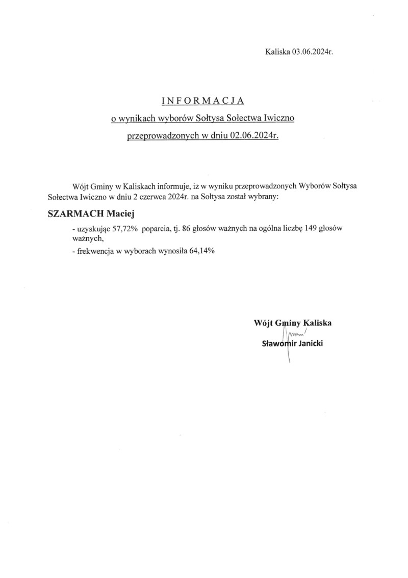 Informacja o wynikach wyborów Sołtysa Sołectwa Iwiczno