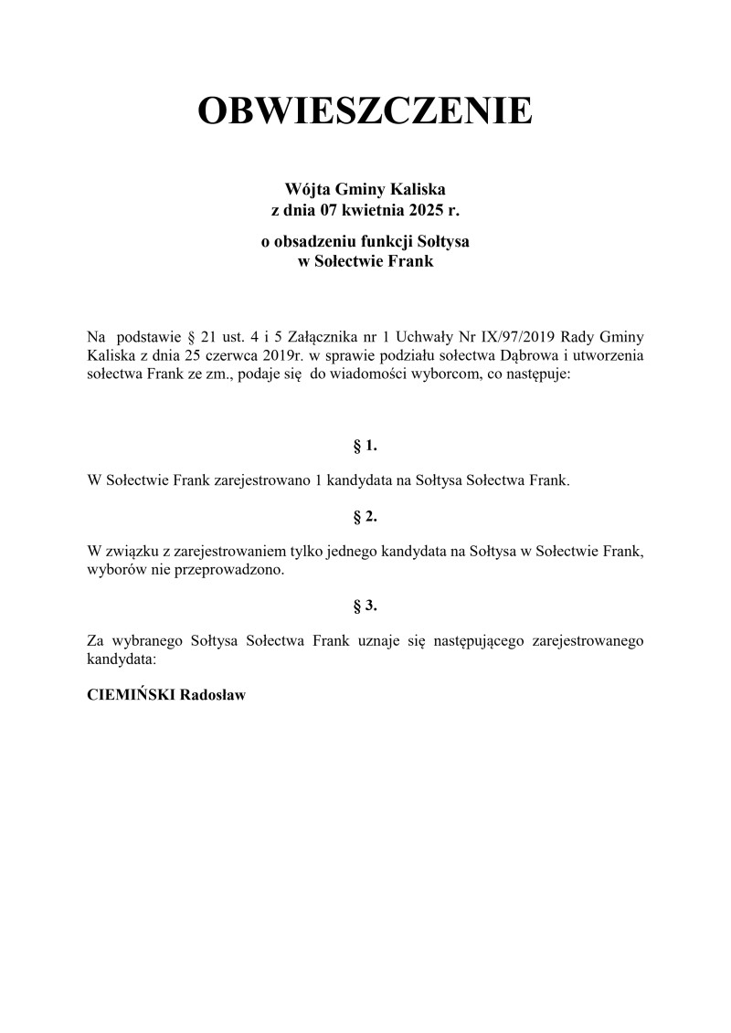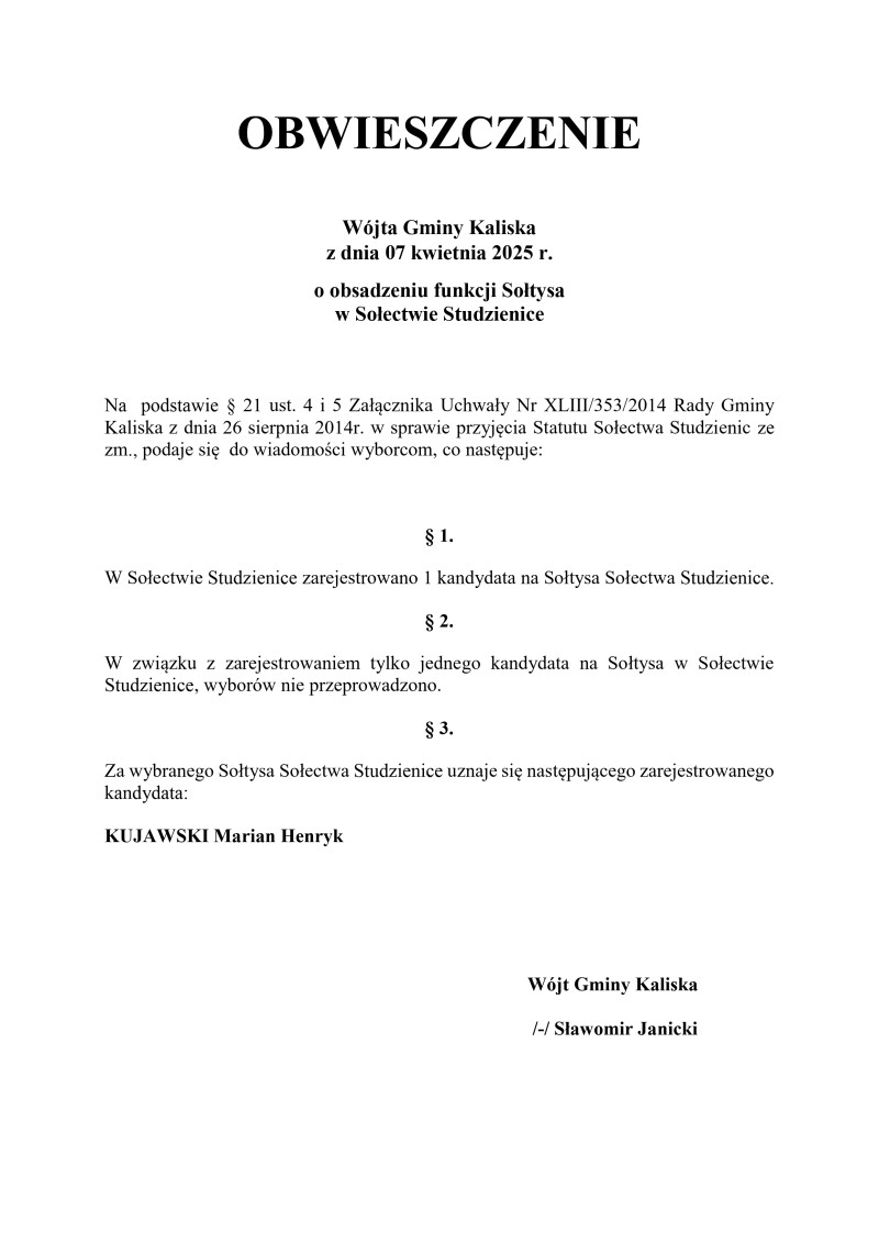 Informacja o wynikach wyborów Sołtysów Sołectw Gminy Kaliska