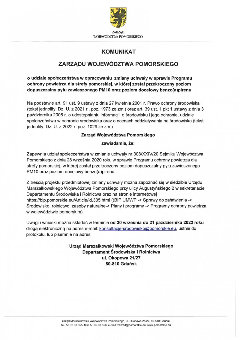 Komunikat Zarządu Województwa Pomorskiego w sprawie zmiany uchwały w sprawie Programu ochrony powietrza dla strefy pomorskiej