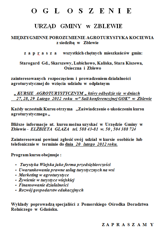 Kurs agroturystyczny - dla zakładających działalność agroturystyczną.