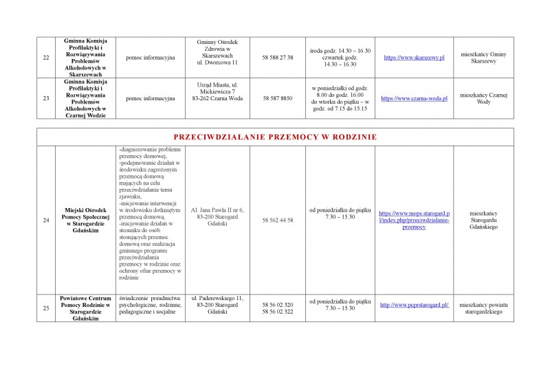 - Skarszewy – punkt prowadzony przez Stowarzyszenie Akcja Społeczna z siedzibą w Gdańsku, ul. Pniewskiego 5/4, 80-246 Gdańsk. Nieodpłatne poradnictwo obywatelskie będzie udzielane przez adwokata lub radcę prawnego. Kontakt: tel. 518 067 954, www.poradnictwo-prawne.pl