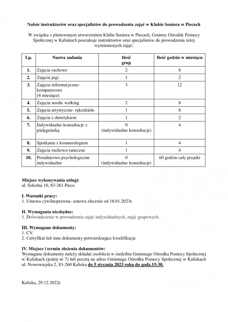 Nabór instruktorów oraz specjalistów do prowadzenia zajęć w Klubie Seniora w Piecach