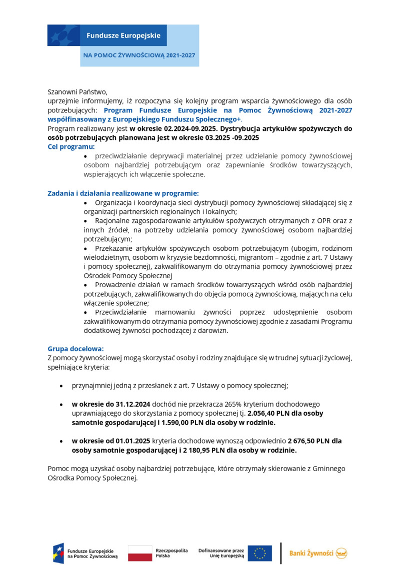 Odbiór żywności w ramach Programu Fundusze Europejskie na Pomoc Żywnościową 2021-2027