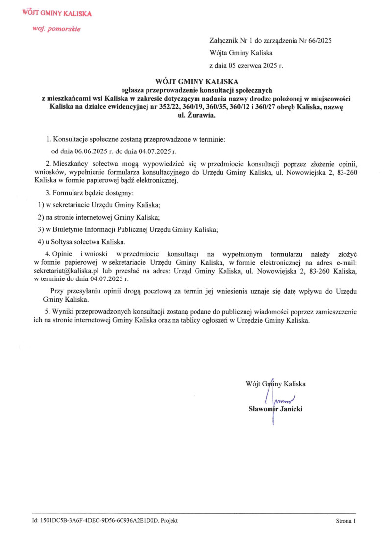 Ogłoszenie o konsultacjach społecznych z mieszkańcami wsi Kaliska
