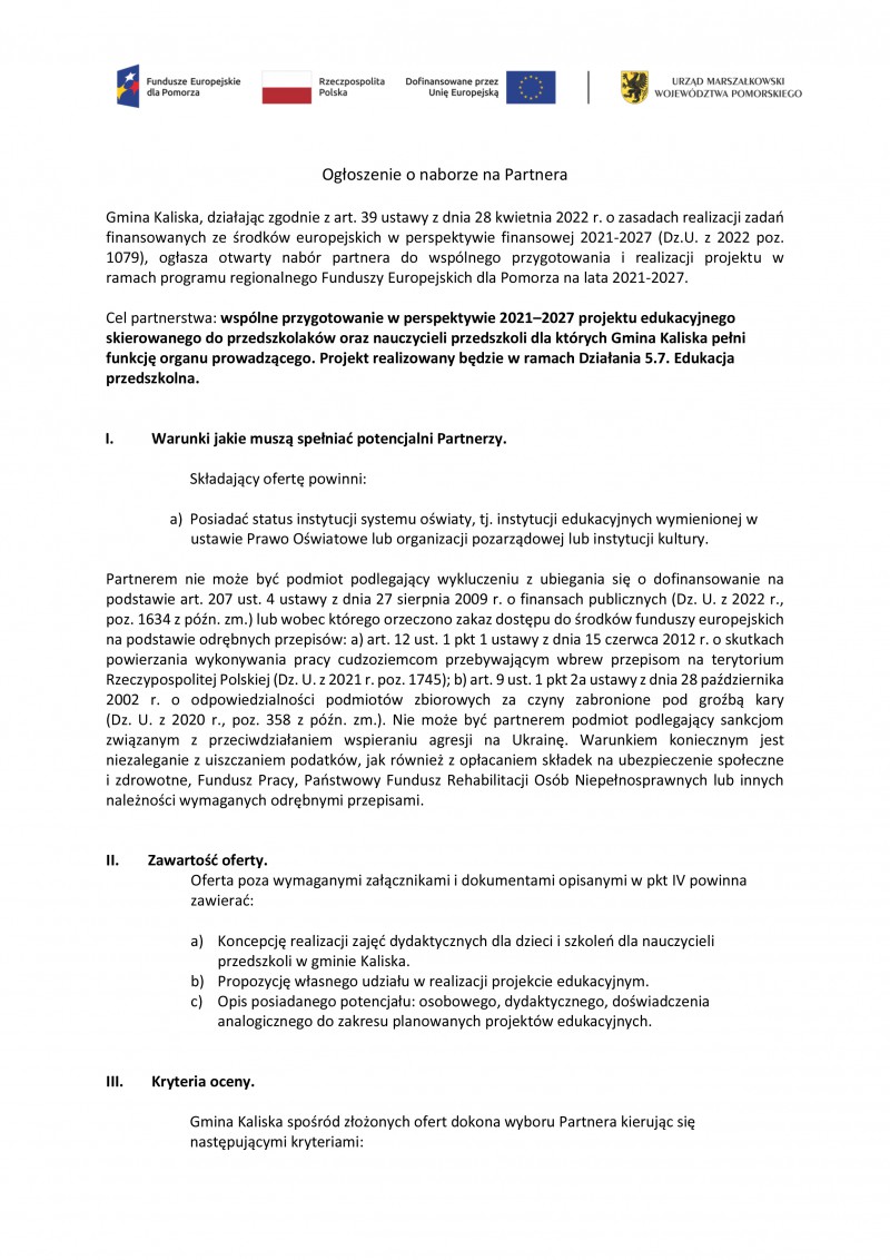 Ogłoszenie o naborze Partnera do realizacji projektu unijnego