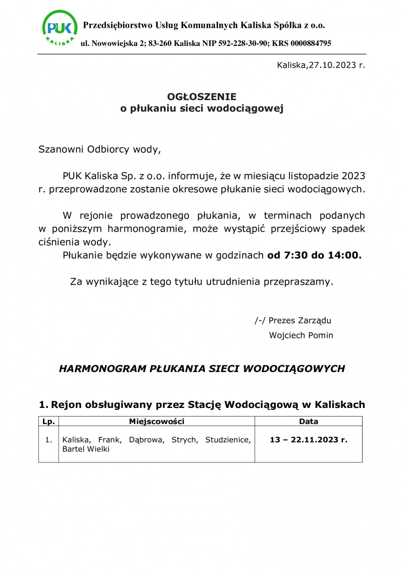 Ogłoszenie o płukaniu sieci wodociągowej